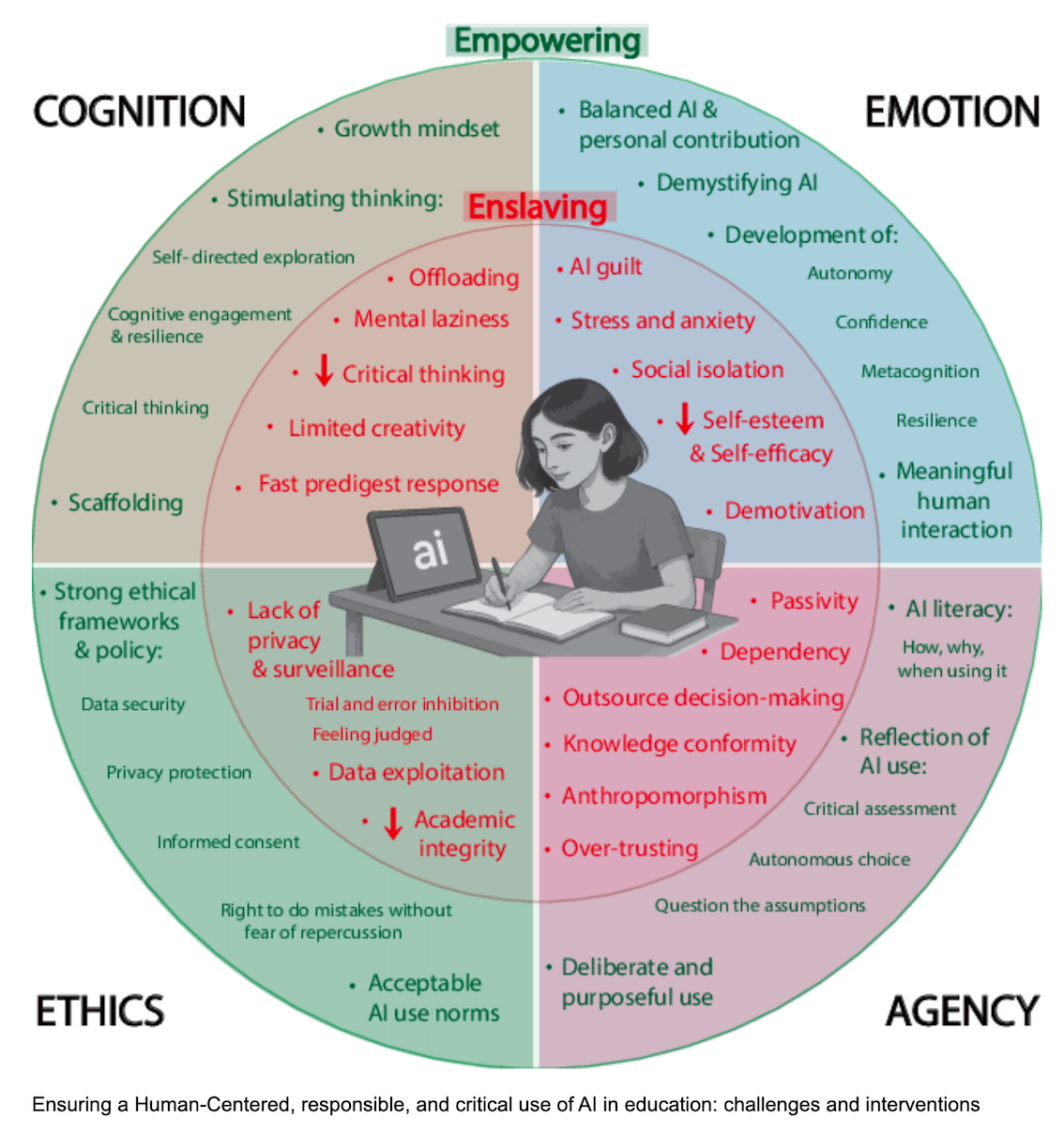 Abbildung: KI kann stärken, aber auch versklaven. Lucile Favero, Juan-Antonio Pérez-Ortiz, Tanja Käser und Nuria Oliver geben in ihrem Paper "Do AI tutors empower or enslave learners? Toward a critical use of AI in education" eine gute Übersicht über Chancen und Gefahren von KI in der Bildung, was sie in der obigen Grafik zusammengefasst haben (https://arxiv.org/pdf/2507.06878).
