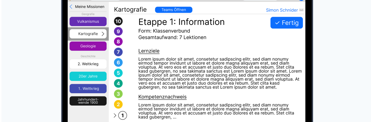 Um die Frontend-Erfahrung zu optimieren, wird die Missionsstruktur anhand konkreter SOL-Beispiele aus der Geografie aufgebaut und direkt implementiert (Kartografie (1) und Vulkanismus (2)).