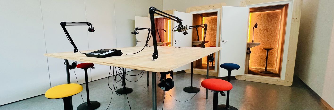Das Media Lab stellt in einem speziell eingerichteten Raum gezielt Infrastruktur zur Produktion von digitalen Lerninhalten zur Verfügung. Es bietet mehrere Kabinen für Audioaufnahmen und ein kleines Filmset für Videodrehs. Durch die akustische Trennung des Raums können in der digitalen Medienwerkstatt verschiedene Produktionen gleichzeitig durchgeführt werden.
