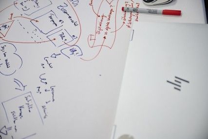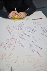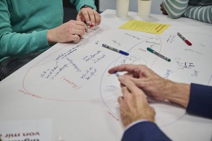 Oliver Wüntsch hat die Mentimeter-Umfragen, die Plakate des Marktplatzes und auch die Notizen des World Cafés auf den Tischtüchern dokumentiert.