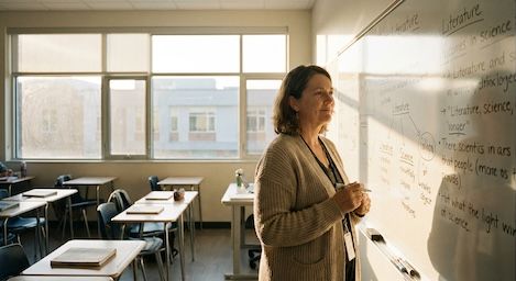 Beispiel: „Fotorealistisches Porträt einer Lehrerin am Whiteboard, modernes Klassenzimmer, warmes Tageslicht, ruhige Atmosphäre, leicht erhöhte Perspektive, hochauflösend"