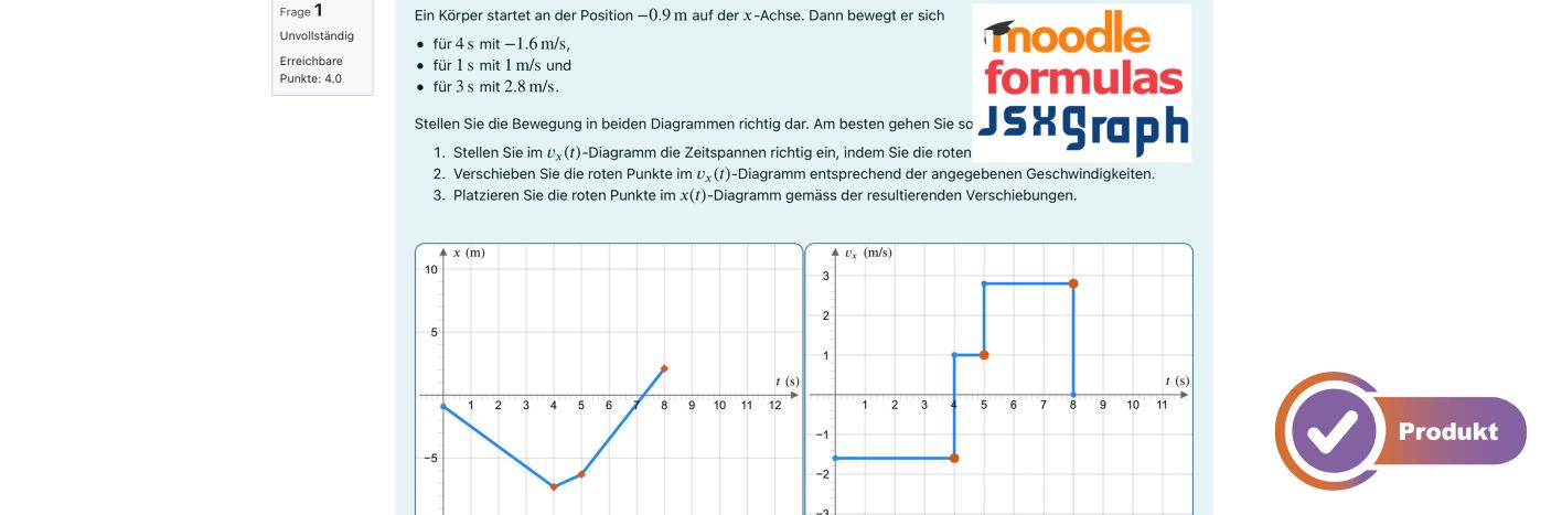 Mit digitalen Mitteln konnten wir bereits Pilotprojekte zu den beiden genannten Aspekten umsetzen. Dafür nutzen wir auf der Lernplattform Moodle den Fragetyp Formulas und erstellen auf zufallsgenerierten Parametern basierende Aufgaben mit numerischem oder Multiple-Choice-Input. Beliebig viele solcher Aufgaben können zu Übungsserien, Lernkontrollen oder auch Prüfungen kombiniert werden. Die SuS können dann je nach Bedarf an wiederkehrenden Aufgaben ähnlicher Natur, aber unterschiedlicher Ausprägung, üben, bevor sie zur nächsten Aufgabe weitergehen. Darüber hinaus lassen sich in Formulas interaktive Grafiken mit der JavaScript-Bibliothek JSXGraph3 einbinden, was den Möglichkeitsraum auf zufällig erstellte und sogar manipulierbare Diagramme, Zeichnungen, Konstruktionen und Simulationen stark erweitert. Je nach Anwendung können die SuS zum Beispiel grafische Elemente «anfassen» und damit Simulationen beeinflussen oder nach gestellten Kriterien verändern, mit sofortigem Feedback zu ihrer Lösung.