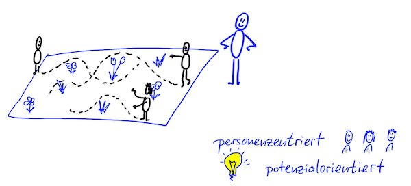 Es geht nicht mehr um Massenproduktion, sondern um das Individualisieren. Solches personenzentriertes und potenzialorientiertes Lernen wird erst möglich, wenn es in einer “Lernwiese” stattfinden kann, wo verschiedene Lernpfade möglich werden.