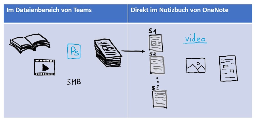 Im folgenden Video zeigen wir unsere Faustregel, welche Dokumente ins OneNote gehören und welche man lieber auf dem OneDrive (oder in Teams) lässt (und nur den Link dazu auf OneNote ablegt).