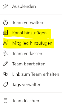 Drückt man auf die drei Punkte beim Namen vom neuen Team, sieht man ein Menu. Hier lassen sich neue Kanäle erstellen oder Mitglieder hinzufügen: team erstellen