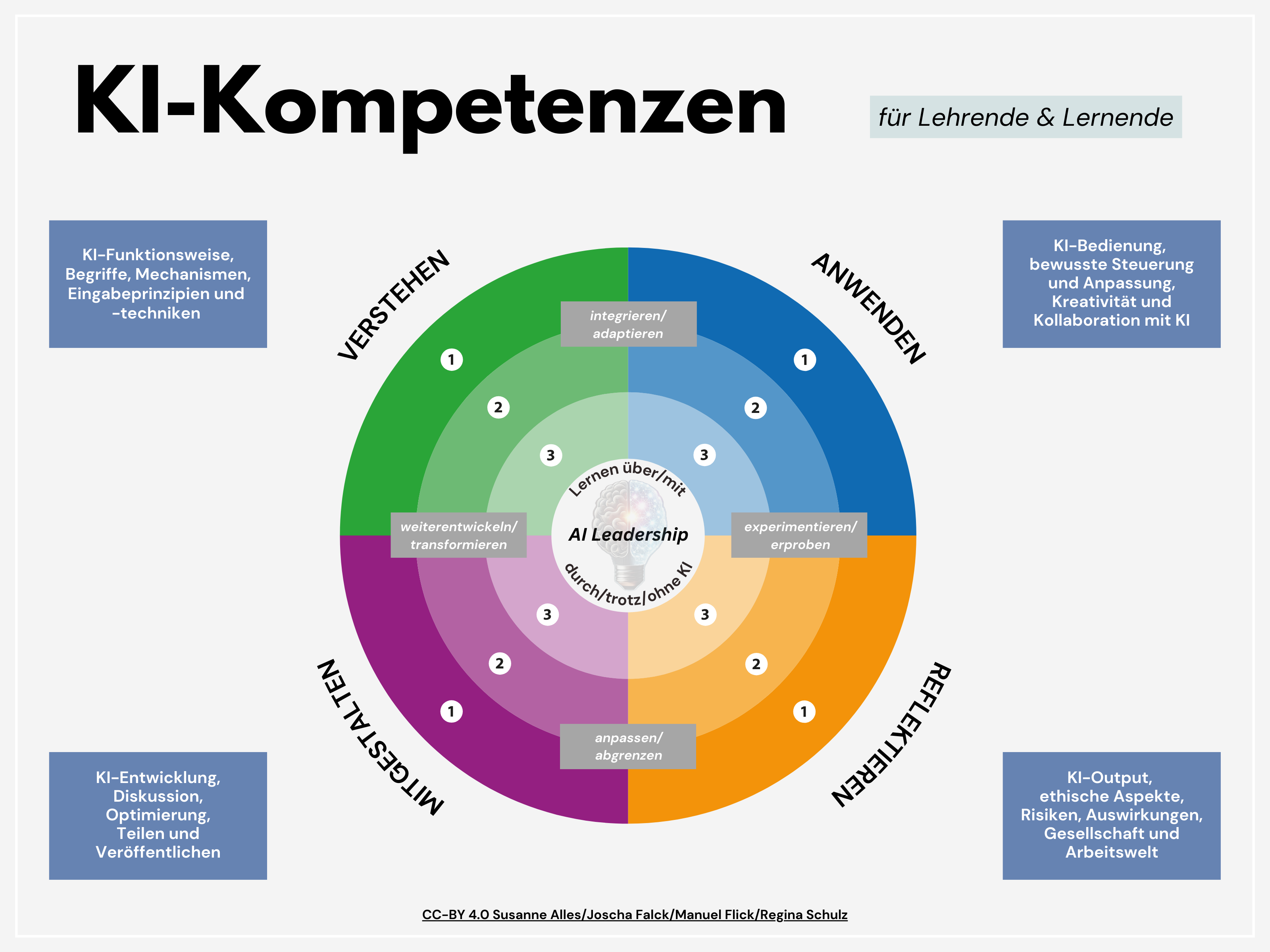Die vier Bildungsexpert:innen Susanne Alles, Joscha Falck, Manuel Flick und Regina Schulz haben ein neues KI-Kompetenzmodell entwickelt - aus der Praxis für die Praxis.