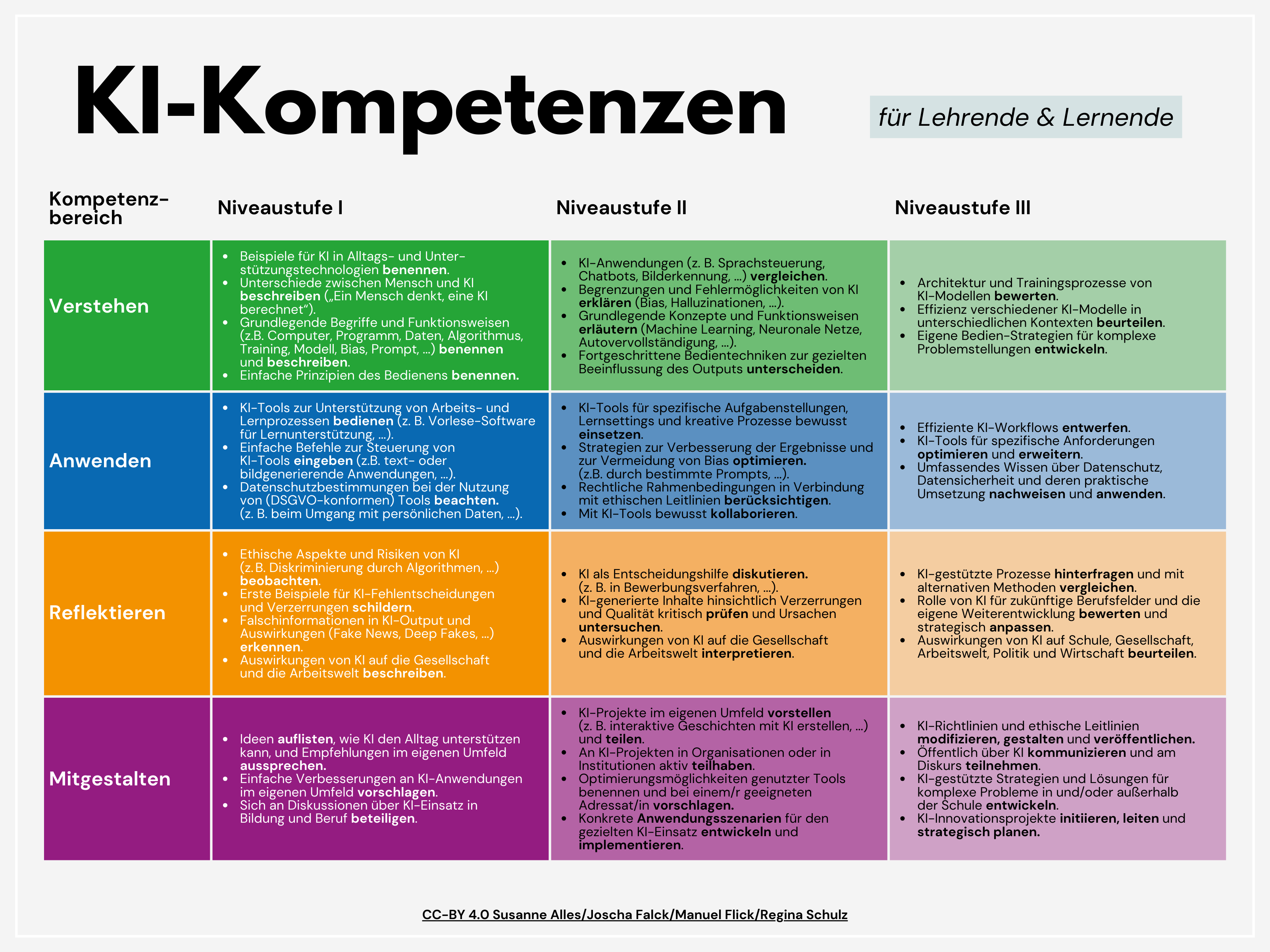 Diese Struktur ermöglicht eine individuelle Weiterentwicklung, sei es für Lehrpersonen, die sich mit KI vertraut machen möchten, oder für SuS/Lernende, die sich gezielt mit KI-Technologien auseinandersetzen und sich entwickeln wollen.